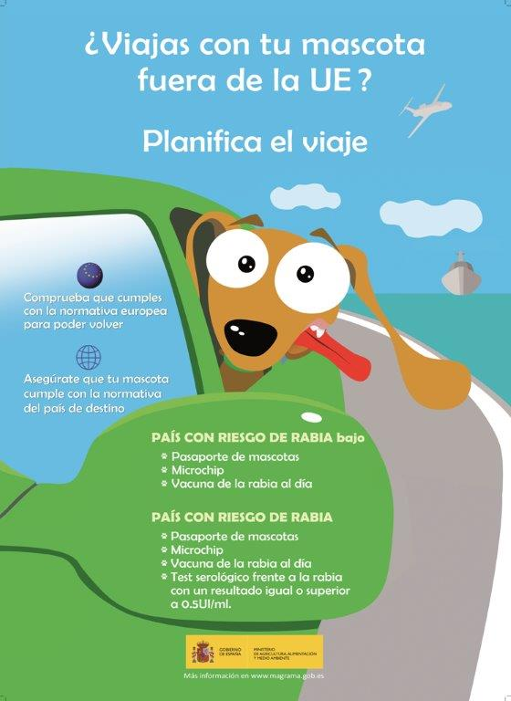 Esta información también será reflejada en el mencionado pasaporte por el veterinario colegiado. Por otro lado, ya que las condiciones de entrada pueden variar según el país de destino, es recomendable acudir a un veterinario con la suficiente antelación. Desde el Ministerio de Agricultura, Alimentación y Medio Ambiente se recomienda consultar a un veterinario al menos dos meses antes del viaje si es dentro de la UE; y con una mayor antelación si el viaje se realiza fuera del espacio europeo.